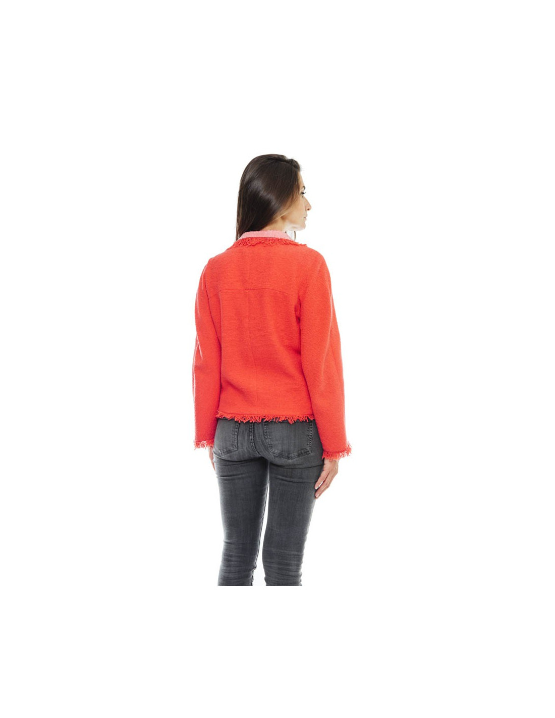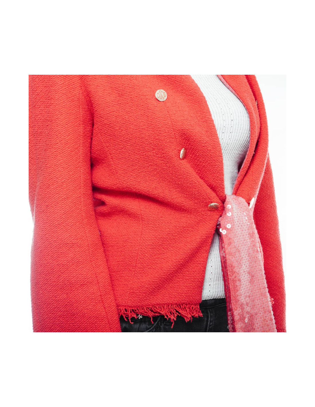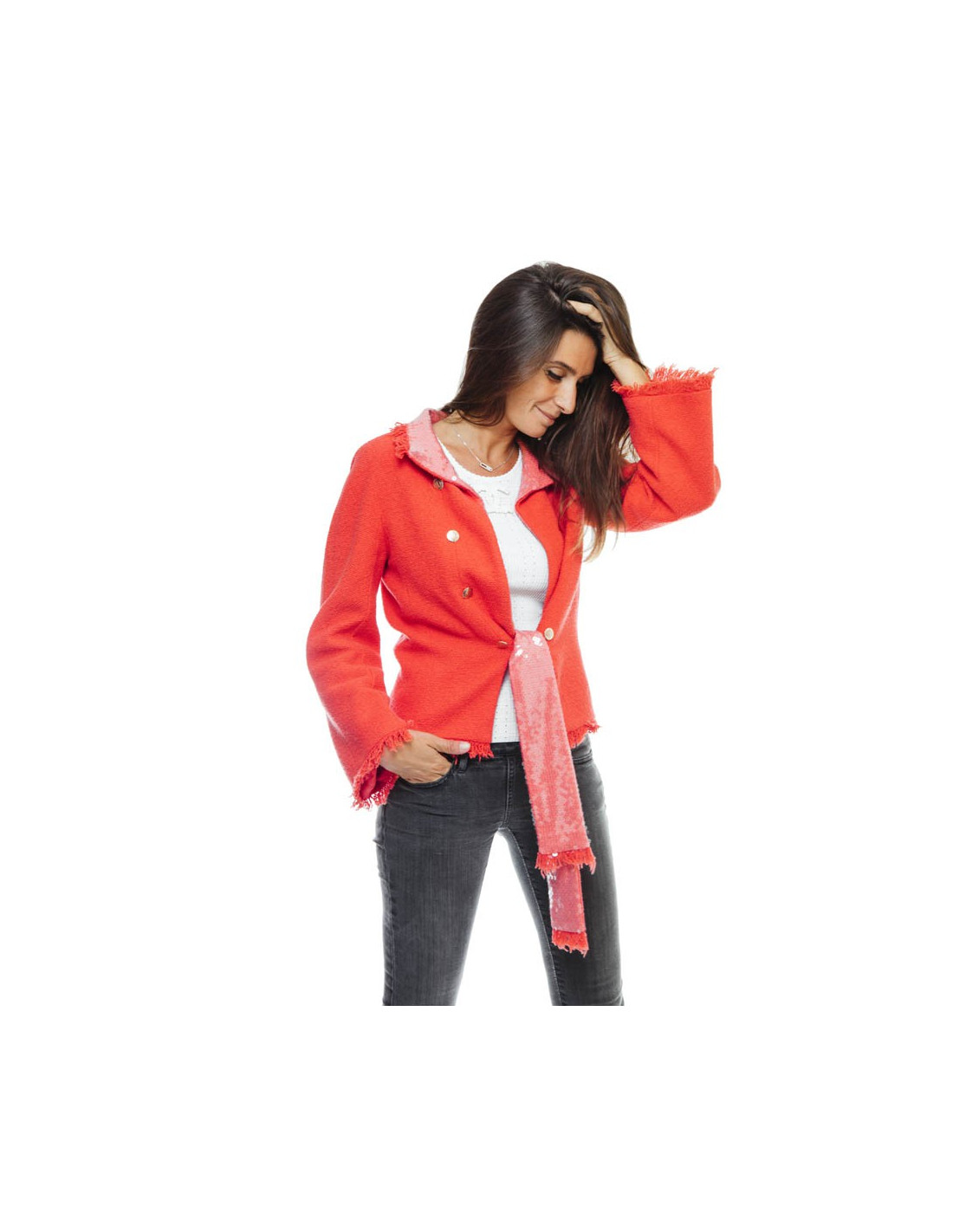 Couleur : corail et col agrémenté de sequins transparents